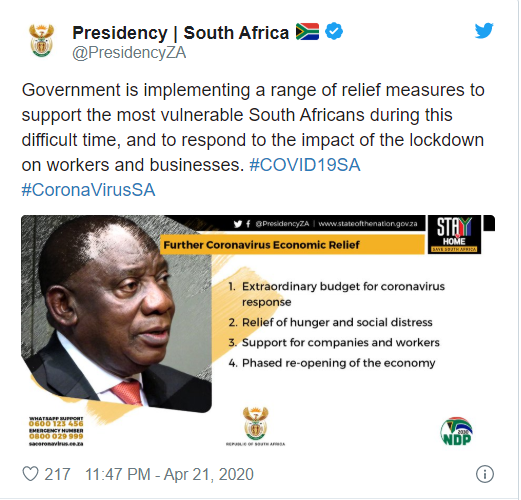 All Cabinet clusters were asked to work together to come up with a single document outlining the key priorities of South Africa’s plan to help citizens and businesses survive the crisis.
