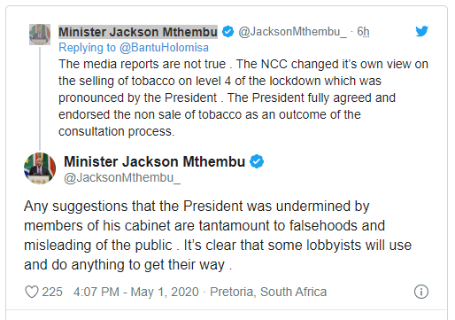 Mthembu responded: “The media reports are not true. The NCC changed its own view on the selling of tobacco on level 4 of the lockdown, which was pronounced by the president. The president fully agreed and endorsed the non-sale of tobacco as an outcome of the consultation process.