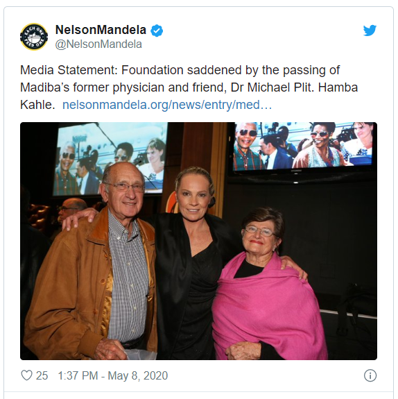 “We have been saddened to hear of the loss of yet another person who played an important role in Nelson Mandela’s life – Dr Michael Plit, who was Madiba’s personal physician for well over two decades.